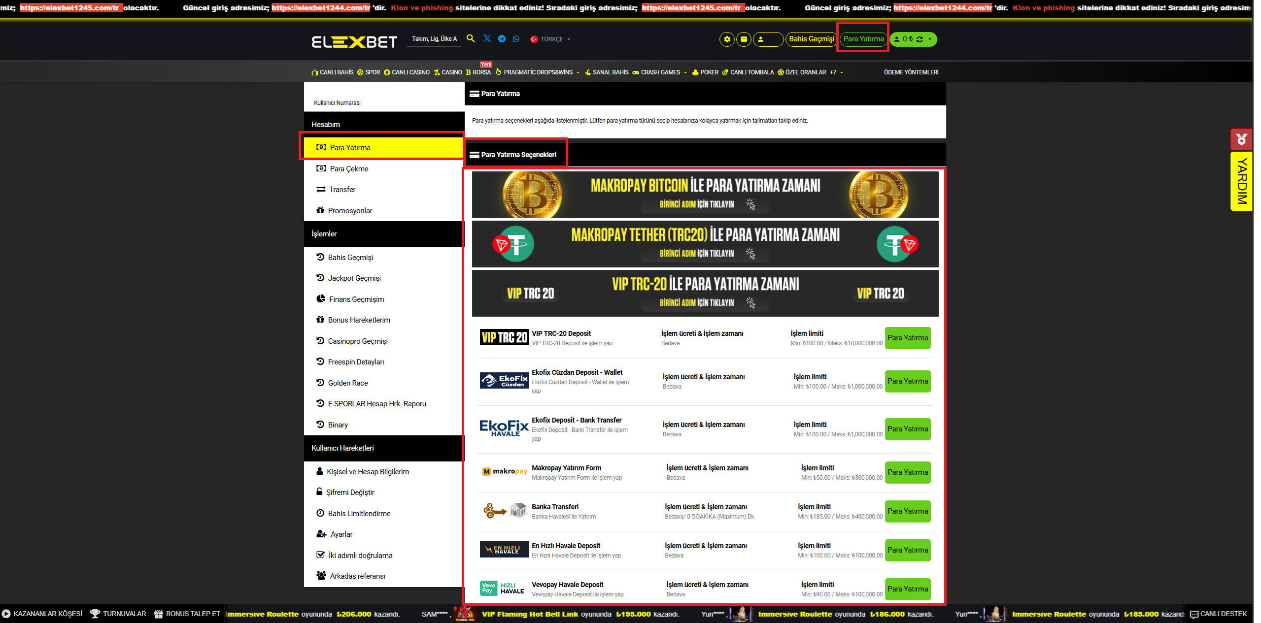 Elexbet bahis ile oyun oynayarak para kazanmak artık çok kolay! Bahis severler elexbet bahis ile promosyon ve bonuslar sayesinde ekstra şans elde ederek kazanç fırsatlarını genişletiyor. Her hafta yenilenen ve bir yenisi eklenen bonus ve promosyonlara, resmi internet sitemize erişim sağlayarak promosyonlar sayfasından göz atabilirsiniz. Size uygun olan promosyonu elde etmek için ise katılım şartlarını yerine getirerek elde edebilirsiniz. Elexbet üzerinden bahislerini gerçekleştirmek isteyenlerin var ise kullanıcı girişlerini yapmaları, yok ise yeni bir üyelik oluşturmak için kayıt olmaları gerekmektedir. Kayıt esnasında girilen bilgilerin doğru ve eksiksiz olduğuna dikkat edilmesi gerekmektedir. Giriş sonrasında para yatırma menüsü seçeneğine giriş yapın. Açılan sayfada para yatırma seçenekleri ile karşılaşacaksınız. Bu seçenekler arasında popüler olan ve hızlı işlemler sağlayan platformlar ise; Bitcoin trc20, banka havalesi, papara gibi ağlar üzerinden yatırım işlemlerinizi gerçekleştirebilirsiniz. Seçmiş olduğunuz ağ üzerinden işleminize devam etmeniz halinde, hesaba para yatırma işlemi gerçekleştireceğiniz hesap bilgileri çıkacaktır. Hesap bilgilerini doğru ve eksiksiz bir şekilde kopyalayın ve para yatırma işleminizi gerçekleştirin. Seçmiş olduğunuz ağ ve platforma göre para yatırma işleminiz 1 ila 10 dakika içerisinde gerçekleşecektir. Hata almanız veya para yatırma işlemlerinde yardıma ihtiyaç duyduğunuzu düşünüyorsanız 7/24 aktif olan destek ekibimizden yardım alabilirsiniz. Elexbet canlı casino olarak bol şanslar, bol kazançlar dileriz.